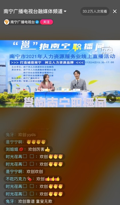 11月24日,由南宁市人力资源和社会保障局主办,南宁市人力资源服务管理办公室、南宁市社会保险事业管理中心、南宁市社会保障卡管理办公室承办,南宁广播电视台协办,智慧人社联合创新实验室提供技术支持的“邕”抱南宁“职播间”——南宁市2021年人力资源服务业线上直播活动开启。广西开云网页版-开云(中国)官方 人力资源有限公司应邀出席,并为大家直播“带岗”。
