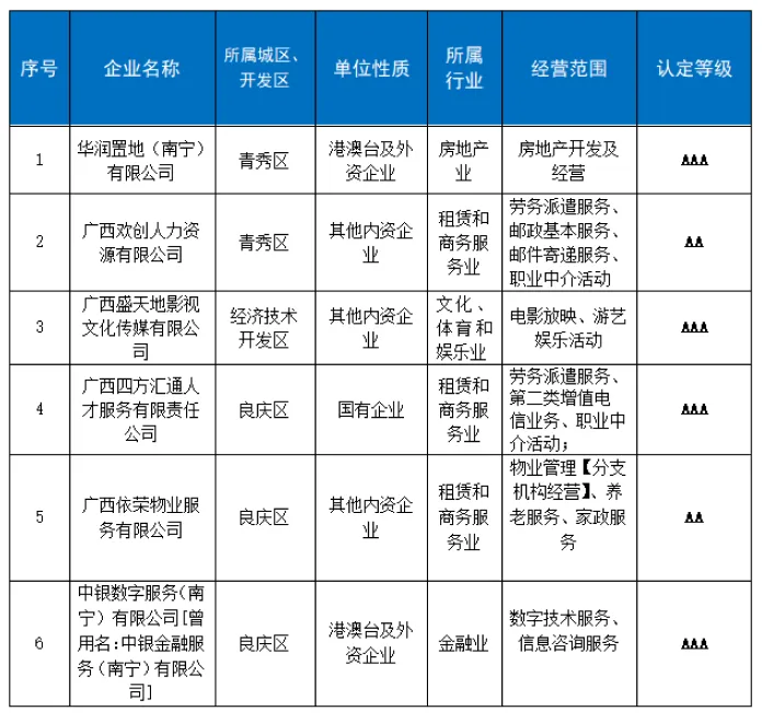 近日,南宁市人社局公布2023年度南宁市劳动关系和谐单位名单,经各企业自愿申报、各主管部门推荐、南宁市协调劳动关系三方实地评审、社会公示程序,从劳动规章制度健全、劳动用工规范、积极开展集体协商等方面严格评选,最终认定华润置地(南宁)有限公司等6家企业为“南宁市劳动关系和谐单位”,其中AAA级4家、AA级2家。被认定企业不被纳入主动监察、稽核的范围,在享受补贴、公共服务、评先评优等方面享受优待。