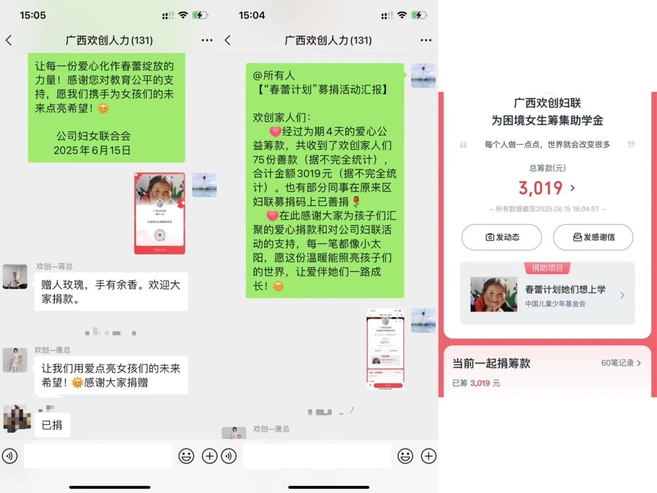 6月12日,广西开云网页版-开云(中国)官方 人力资源有限公司妇女联合会积极响应自治区妇联的号召,组织开展了爱心募捐活动。公司全体员工积极参与,积小善,成大爱,以实际行动为社会尽一份责任,献上自己的一份爱心。经过在公司内部发动爱心公益筹款,共收到了75份善款,合计金额3019元(据不完全统计)。捐赠不论多少,善举不分大小,一笔笔善款汇聚成一股股爱心暖流流进贫困女童的心田,每一份爱心都将化作春蕾绽放的力量助她们乘风破浪、向阳生长。